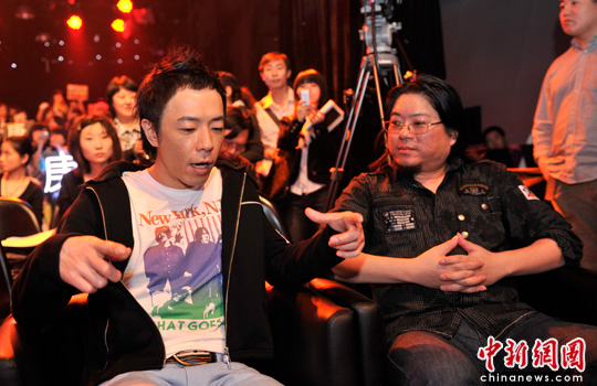 图为黄贯中与高晓松交流器乐心得。中新网记者 金硕 摄