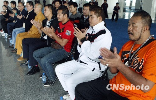 图为泰拳王为少林寺武僧表演鼓掌。中新社发 钱兴强 摄