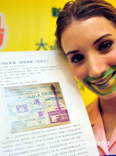 5月18日,女模展示第一届世界杯1930年乌拉圭入场票。为迎接南非世界杯,香港一商场将举办《经典世杯狂热珍藏展》,展出约千件有关世界杯的珍品。