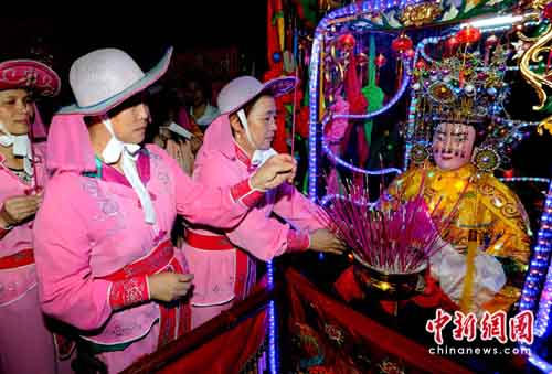 5月19日,为弘扬妈祖文化,100多位妈祖信众护送福州仓山林浦天后宫妈祖金身巡安三坊七巷。图为参加该巡安仪式的着盛装的妈祖信众在福州三坊七巷天后宫内向妈祖金身进香。