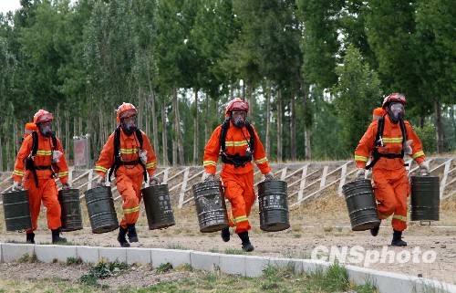 图为官兵们5月18日在训练负重32公斤水快速前行。中新社发 徐长安 摄