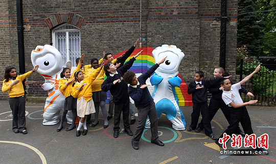 伦敦奥运会吉祥物和小学生共仿博尔特“飞天”。CFP