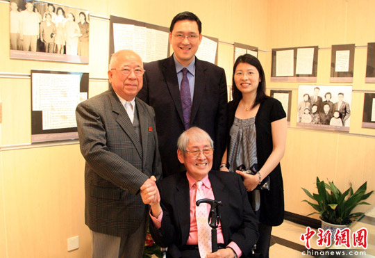 5月20日,香港名家邓广殷先生(中)携子女专程到上海宋庆龄故居纪念馆,参加“邓广殷及家人藏宋庆龄书信刊布赠阅暨展览”开幕式,并与当年在宋庆龄身边的工作人员李家炽(左)一起合影。当日,在该书信集刊布赠阅暨展览上,首次亮相了宋庆龄从1970年至1980年分别写给邓广殷以及其太太孙君莲和长女邓勤等的英文亲笔书信共197封,书信的内容真实地反映了宋庆龄晚年的思想、生活、对人和事的看法,对友人的关心以及对上海寓所的眷恋,是研究和考证宋庆龄晚年时期思想活动不可多得的珍贵资料。
