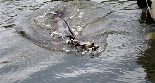 一只受过训练的海狮叼着可疑物向警方快艇游来