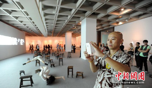 5月20日,艺术家洪强在其作品《燕老米的雅》展出现场,拍摄舞蹈家杨春江、梅卓燕、陈敏儿及王荣禄为“香港当代艺术双年奖2009”展览开幕典礼志庆舞蹈。中新社发 郑祚声 摄
