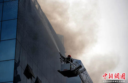 中新网乌鲁木齐5月21电(记者 刘新)5月21日17点左右,新疆乌鲁木齐二道桥商业区国际大巴扎旁一楼宇顶楼发生火灾,大火造成的滚滚浓烟,老远就能看见。