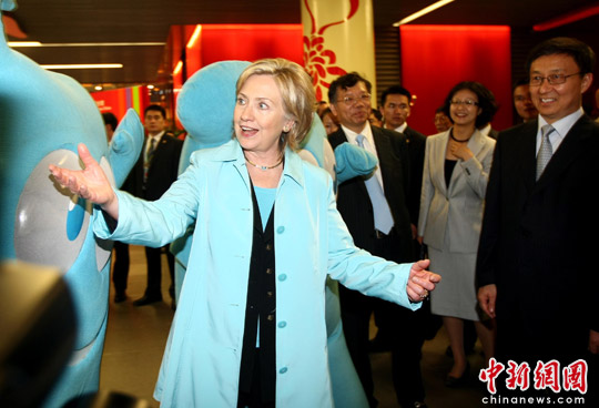 图:美国务卿希拉里世博会与“海宝”互动