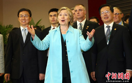 5月22日,美国国务卿希拉里·克林顿参观上海世博会中国馆动态清明上河图。中新社发 杜洋 摄
