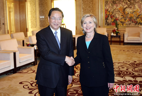 5月22日,上海市市委书记俞正声在上海世博中心会见美国国务卿希拉里·克林顿。中新社发 杜洋 摄