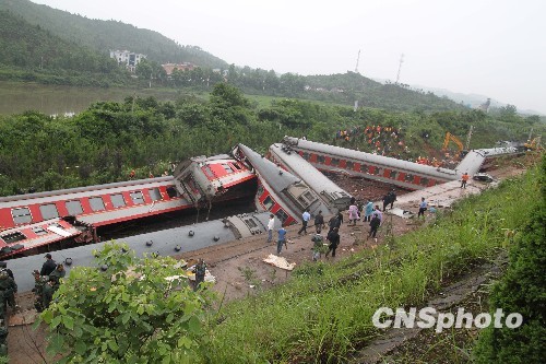 由上海南开往桂林的K859次列车脱线事故发生现场。 中新社发 何江华 摄
