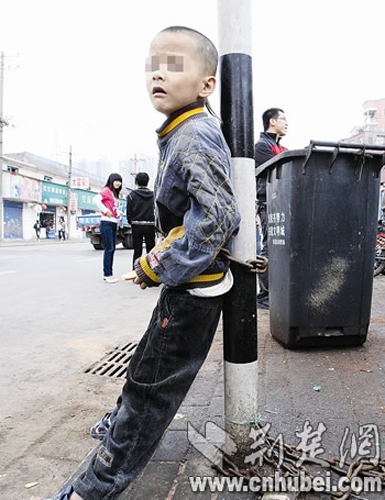 一男子用铁链将自己8岁的儿子锁在路边,并在一旁挂出标语求人收养。5月22日,在武昌秦园路上,该男子的荒唐之举受到过往市民强烈谴责。