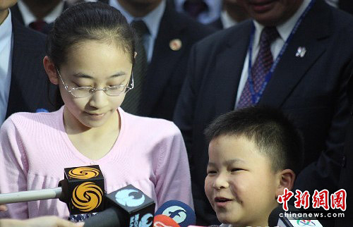 5月23日,来自四川汶川地震灾区的抗震小英雄林浩(右)与“芭蕾女孩”李月(左)随中共四川省委书记刘奇葆一同抵台访问,走出台北松山机场时受到台湾媒体追捧,成为明星人物。中新社发 罗钦文 摄