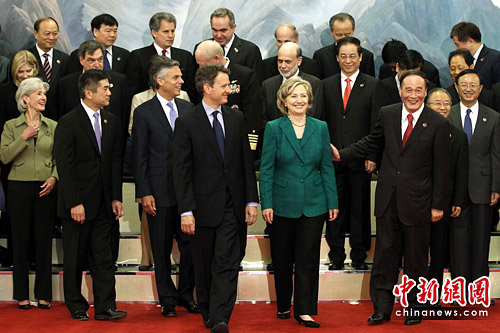 5月24日,第二轮中美战略与经济对话在北京开幕,双方代表团主要成员在北京人民大会堂集体合影。中国国务院副总理王岐山和国务委员戴秉国作为中国国家主席胡锦涛的特别代表,同美国总统奥巴马的特别代表、国务卿克林顿和财政部长盖特纳共同主持对话。