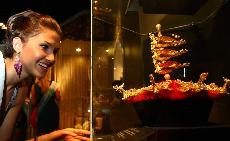 5月24日,全球64位比基尼佳丽们参观中国首家珍珠博物馆--海南京润珍珠博物馆,赶赴一场珍珠盛宴。展厅中一顶镶嵌珍珠的中式皇后凤冠吸引佳丽们的眼球。近日,参加第35届国际比基尼小姐全球总决赛的64位选手抵达海南三亚,展开为时9天的时尚美丽之旅。在这期间,佳丽们将参加包括三亚特色景点游、海滩趣味运动会、比基尼DIY设计大赛等一系列活动。29日晚,64位佳丽将决出第35届国际比基尼小姐全球总冠军。中新社发 富田 摄