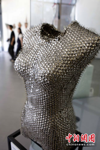 5月24日,2010高校环保艺术节系列活动在北京CBD核心区的朝外SOHO举行。高校艺术节在白领中的传播,将白领这一社会主流推向了环保的第一线。本届环保艺术节以“环保”为主题的静态艺术、歌颂地球之声的音乐、展现自然生态魅力的舞蹈和多媒体展示,展现人与自然的和谐及相处之道。图为由图钉制作的《刺》。中新社发 任海霞 摄
