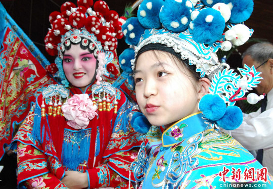 5月25日上午,华裔学生滕学仪(音,前)与美国学生一起身着戏服,在中美人文交流高层磋商机制成立仪式上为大家表演了中国传统京剧节目。