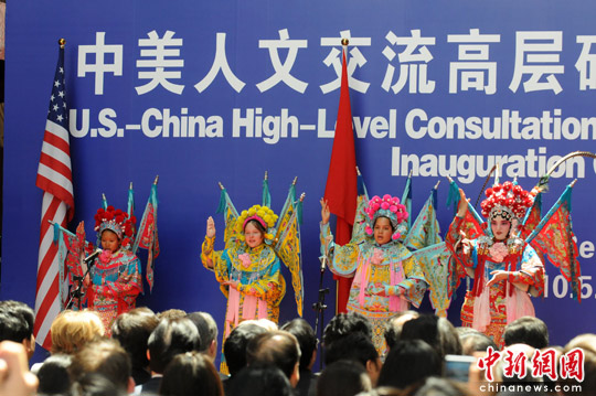 5月25日上午,中美人文交流高层磋商机制成立仪式在北京举行,来自美国的学生为大家表演了中国传统京剧节目。中新社发 侯宇 摄