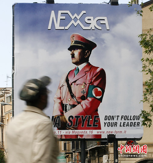 近日,意大利西西里首府巴勒莫街头随处可见一款备受争议的海报――臭名昭著的纳粹头子希特勒化身“粉红男郎”,纳粹军服胳膊上的纳粹符号被大大的粉色心形图案代替。据悉,这款海报主要是为了鼓励年轻人穿出自己的风格。该海报亮相后,立即在当地引起争议热潮。很多人表示这样的海报令人生厌,并呼吁立即将海报撕掉。
