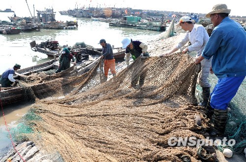 5月25日,江苏连云港渔港码头,渔民在做进入休渔期的准备。中新社发 王春 摄