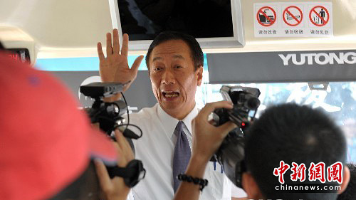 富士康科技集团总裁郭台铭现身深圳富士康厂,海内外200多名媒体记者围堵追访。中新社发 陈文 摄