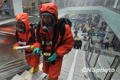 5月26日上午,南京市组织地铁、公安、消防、交通、卫生等多部门在即将正式营运的地铁二号线兴隆大街站,联合开展突发事件应急演练,加强处置轨道交通各类应急事件合成作战能力,检查现有应急预案的可操作性和实用性。中新社发 海风 摄