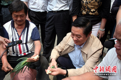5月26日,中共四川省委书记刘奇葆一行到台湾“9·21”地震灾区南投县参观考察,图为他走访安置震后老人的埔里镇菩堤长青村时,蹲在地上与福利社区老人一起边择菜边聊家常。