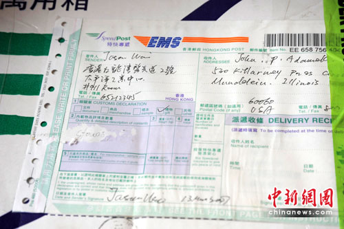 图为非法寄送这批生物化石的香港寄件人和伊利诺伊州收件人的地址和姓名曝光。中新社发 吴庆才 摄