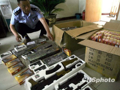5月27日,河北警方在全省开展大规模仿真枪、弹弓、弩类杀伤性物品清缴行动。近期,在该省居民区内发生4起“飞弹”袭击事件。河北省公安厅26日发布《关于收缴爆炸物品枪支弹药的通告》,严禁非法制造军用枪、射击运动枪、仿真枪等各类枪支、弹药,严禁非法持有、私藏、携带枪支、弹药等爆炸物品。图为警方查点清缴的部分长、短仿真枪。中新社发 翟羽佳 摄