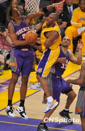 当地时间5月27日晚,NBA西部决赛第五场比赛在洛杉矶举行,洛杉矶湖人险些被菲尼克斯太阳队逆转,幸亏阿泰斯特压哨投中,以103比101击败对手,在西部决赛中3比2领先。科比·布莱恩特拿下30分、11个篮板和9次助攻的准三双。中新社发 张炜 摄