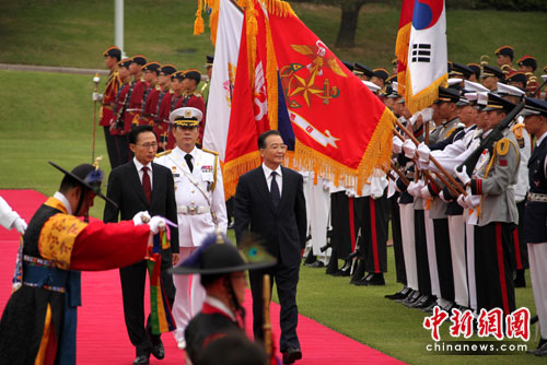 5月28日,韩国总统李明博在青瓦台大草坪举行欢迎仪式,欢迎中国总理温家宝对韩国进行正式访问。
