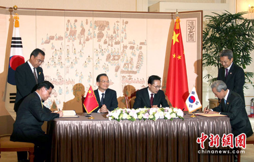5月28日,正在韩国访问的中国总理温家宝与韩国总统李明博共同出席两国有关合作文件的签字仪式。