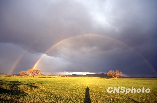 5月28日,雨后的内蒙古克什克腾草原出现了“双彩虹”奇观。双彩虹是由水滴对阳光的折射及反射而造成,极为罕见。中新社发 孙国树 摄