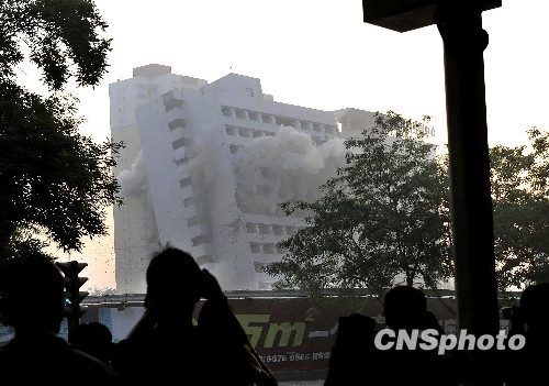 5月29日早上5时30分,位于石家庄市中心的石家庄财政局培训中心主楼进行了定向爆破拆除,据悉该地段将会建成一个大的商业中心。图为爆破现场外吸引了很多市民围观。中新社发 刘震 摄