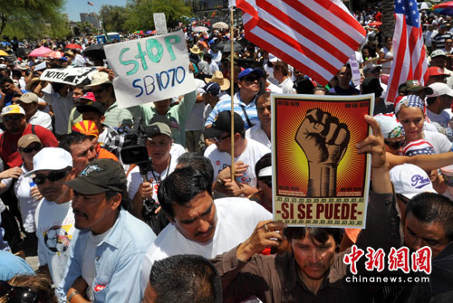 当地时间5月29日,数万名抗议者在美国亚利桑那州凤凰城举行声势浩大的游行示威活动,抗议亚利桑那州通过全美最严苛的反非法移民法案,两个月后,该法案将正式生效。这是该法案通过以来,凤凰城举行的最大规模的抗议游行。图为抗议者呼吁抵制联邦参议员麦凯恩。麦凯恩是该法案的坚定支持者。中新社发 张炜 摄