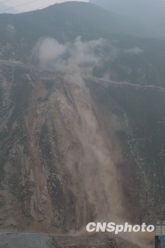 5月30日下午2点40分左右,汶川县国土部门对塌方体实施首次爆破处理。29日汶川雁门乡发生的塌方事故中,共计塌方量超过1万立方米,并造成国道213线完全阻断,沿国道形成了长400多米、宽200多米的松散垮塌体。据有关部门透露,截止目前,在塌方道路两侧仍有千余辆滞留车辆,如果排危进展顺利,预计今晚能疏通主要交通。图为首次爆破现场。中新社发 汶川新闻中心 供