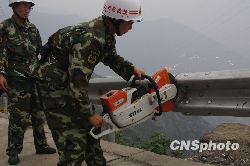 图为抢险人员正在对塌方处的防护栏进行切割处理。中新社发 汶川新闻中心供图