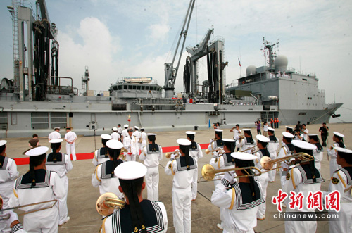 5月31日,在中国海军“三亚”号护卫舰的引导下,由法国海军印度洋海区司令布鲁诺·尼埃里中将率领的“索姆”号补给指挥舰缓缓驶入广东湛江某军港,对海军南海舰队开始为期6天的友好访问。中新社发 陈耕 摄