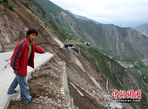 图为一位村民正在向记者介绍通往萝卜寨的道路中断情况。 中新社记者 刘忠俊摄