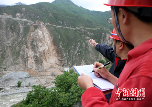 图为四川省国土厅的相关人员正在现场绘制山体垮塌图。 中新社记者 刘忠俊摄