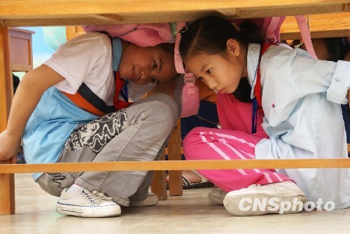 5月31日,南宁市一所农民工子弟学校组织1000多名儿童,进行地震安全防护演练,培养孩子们安全成长意识,迎接“六·一”国际儿童节。中新社发 罗先彬 摄