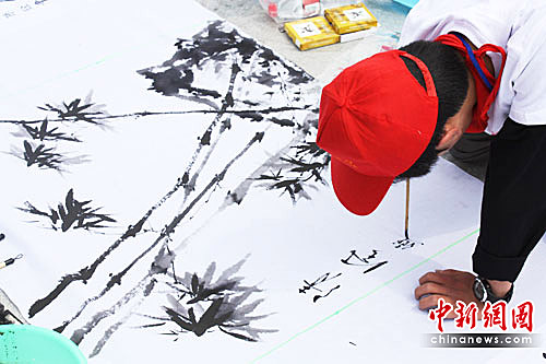 江苏盐城百名少儿泼墨挥毫“与世博同行”(2)