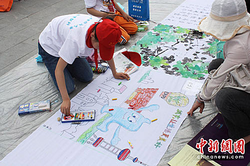 江苏盐城百名少儿泼墨挥毫“与世博同行”(4)