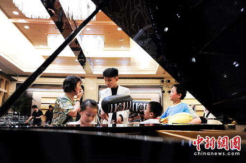 小钢琴家牛牛(白西服者)为一名女孩辅导琴艺。中新社记者 廖攀 摄