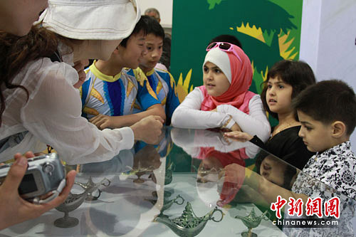 世博园伊拉克馆内,上海儿童和伊拉克儿童在阿拉丁神灯展柜前交流。中新社记者 殷春永 摄