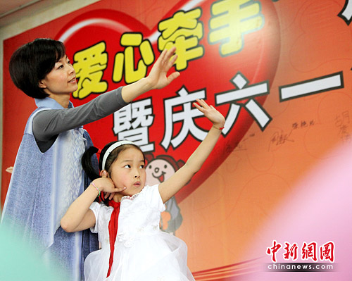 5月28日,歙县育鸿留守儿童学校校长汪育红,在“爱心牵手”启动仪式上与留守儿童表演舞蹈“母亲”。吴建平 摄