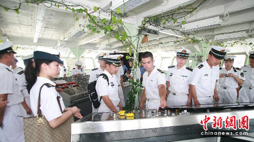 6月1日,中国海军官兵登上正在湛江进行友好访问的法国海军“索姆”号补给指挥舰上参观。访问期间,两国海军官兵将通过相互参观军舰、中法海军官兵交流反海盗经验、两国陆战队员联合训练等军事交流活动,增进了解,深化友谊。中新社发 陈耕 摄