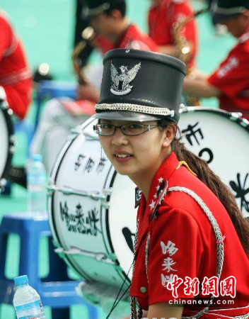 6月2日上午,河南安阳一活动开幕式上,美丽的姑娘敲打着鼓乐,她们清纯的气质、娇美的容颜和得体的衣着,动感的鼓点,吸引众多民众前来拍照,一时成一道亮丽风景。中新社发 王中举 摄