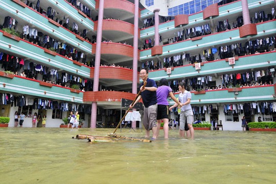 6月2日,高三24班班主任王明武老师撑竹筏接送学生。黄孝邦 摄