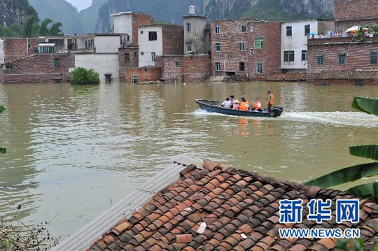 6月3日,在广西忻城县北更乡,救援人员在街道上搜救被困人员。周华 摄