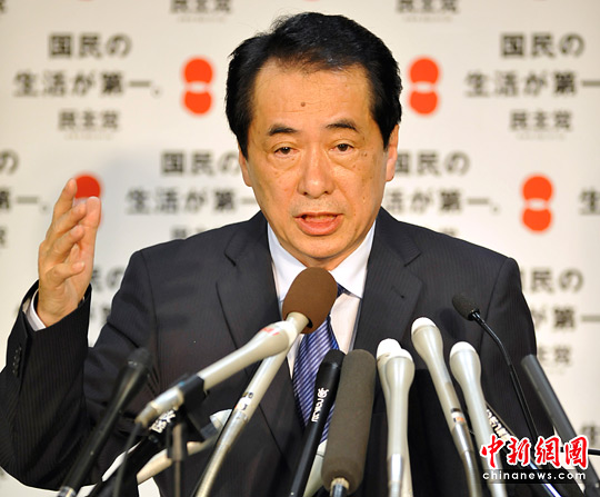 图为6月3日,日本东京,菅直人在民主党的记者招待会上讲话。